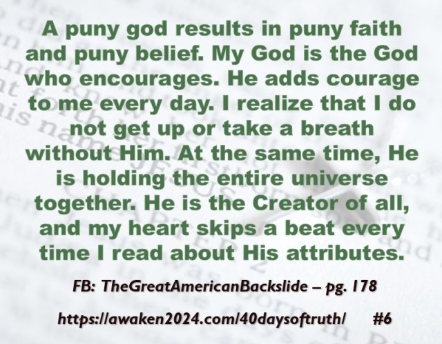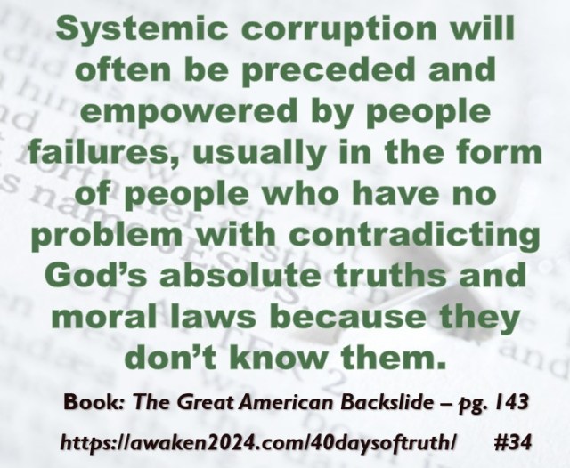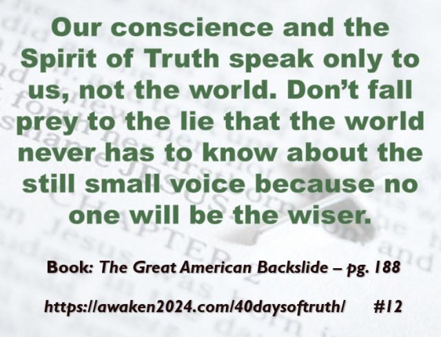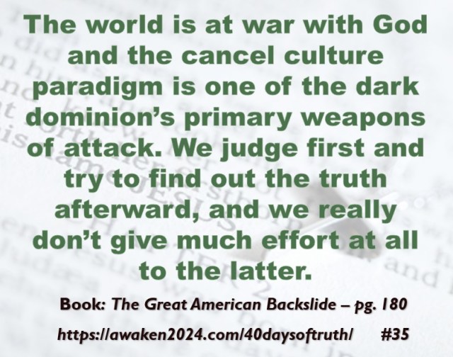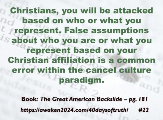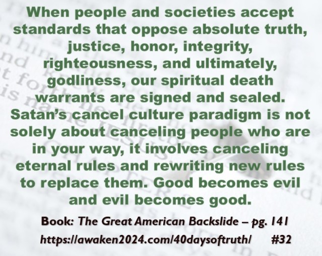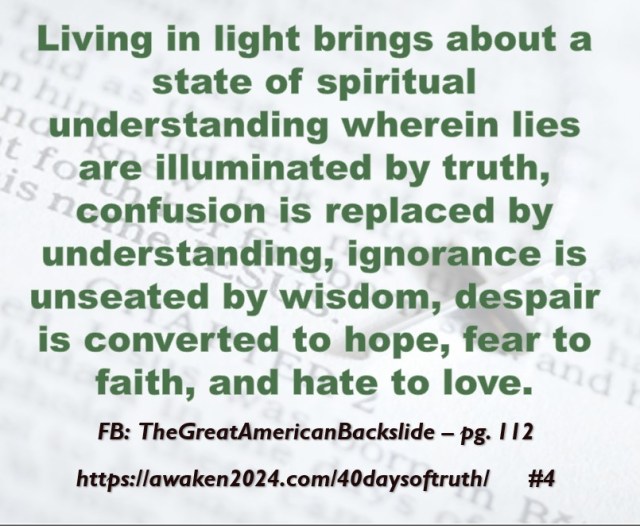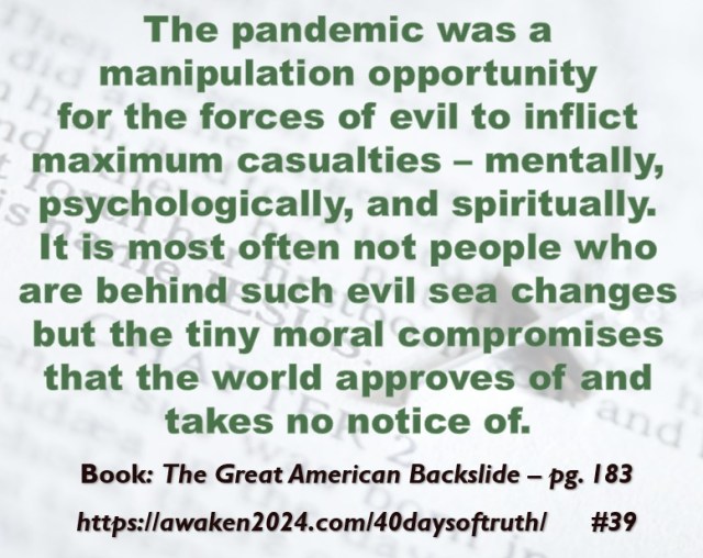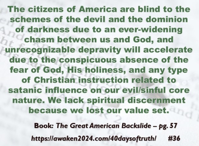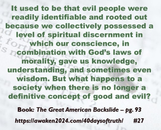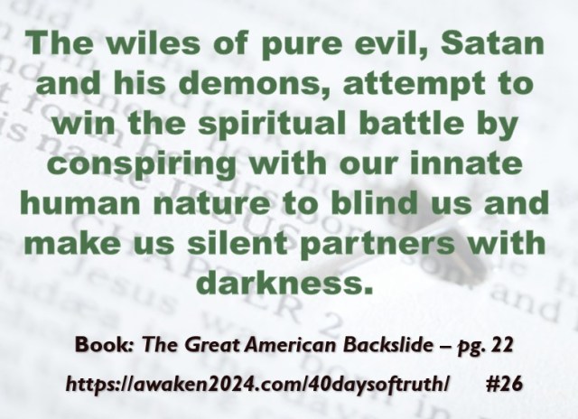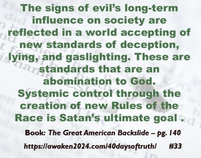 The following excerpts were pulled from our book The Great American Backslide and Our Silent Partnership with Darkness – Living in Opposition to Evil’s Influence. These quotes were also posted on Facebook at The Great American Backslide and on X @NcourageTruth. Over the first half of the 40-day period, the quotes are considered ‘easy truths.’ For the second half, quotes 21 – 40 would be examples of some ‘hard truths’ about being a Christ-follower in this fallen world. We can’t have the easy without the hard if we are to be salt, light, and love in a fallen world. The page number where each quote is found in the paperback release of the book is found at the bottom of each slide. May they bring knowledge, understanding, wisdom, and blessings to those who read them. In Jesus’ name, Amen.