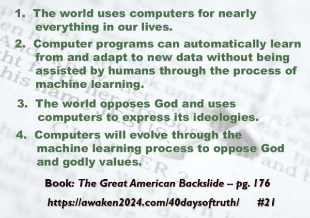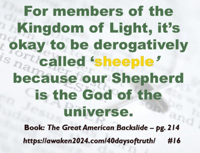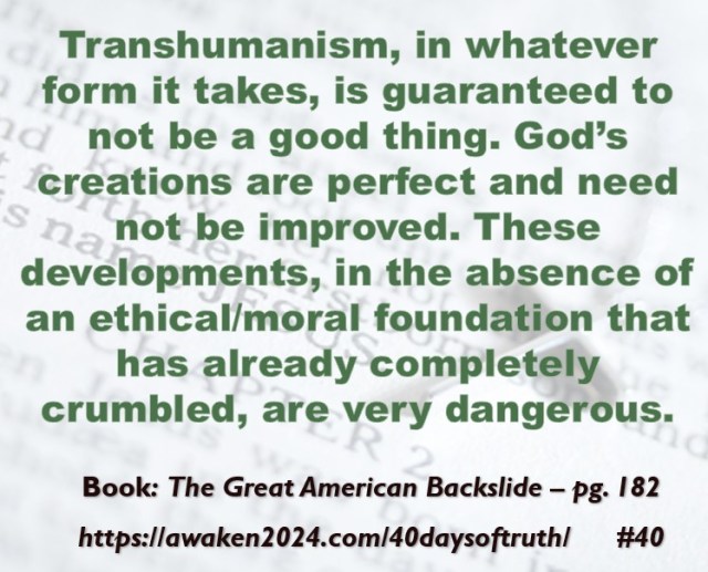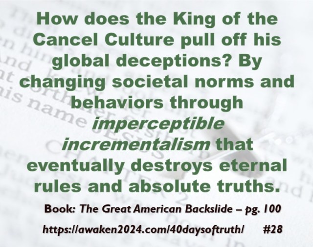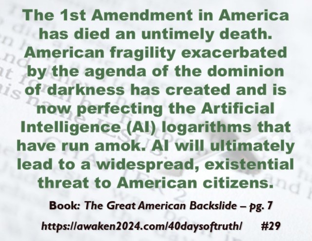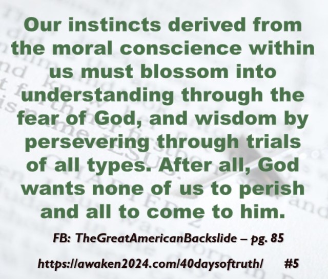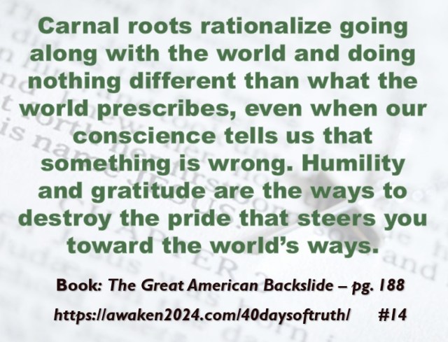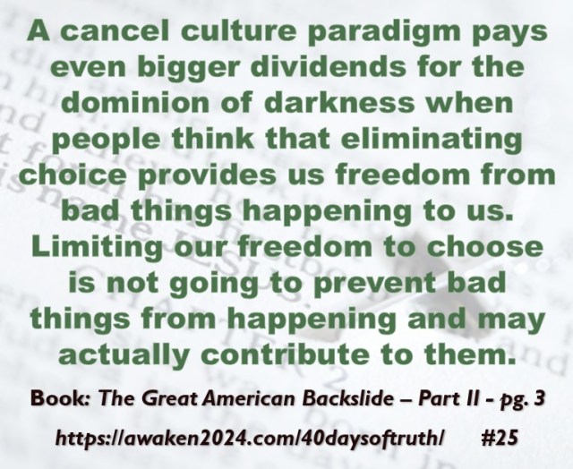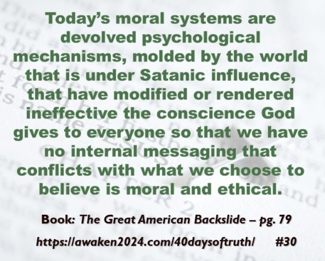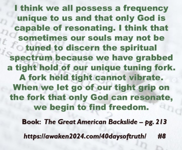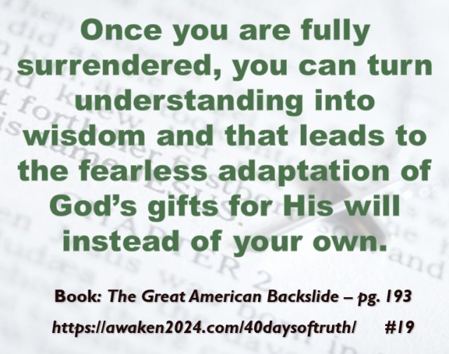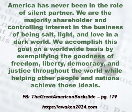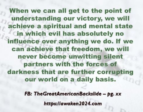 The following excerpts were pulled from our book The Great American Backslide and Our Silent Partnership with Darkness – Living in Opposition to Evil’s Influence. These quotes were also posted on Facebook at The Great American Backslide and on X @NcourageTruth. Over the first half of the 40-day period, the quotes are considered ‘easy truths.’ For the second half, quotes 21 – 40 would be examples of some ‘hard truths’ about being a Christ-follower in this fallen world. We can’t have the easy without the hard if we are to be salt, light, and love in a fallen world. The page number where each quote is found in the paperback release of the book is found at the bottom of each slide. May they bring knowledge, understanding, wisdom, and blessings to those who read them. In Jesus’ name, Amen.